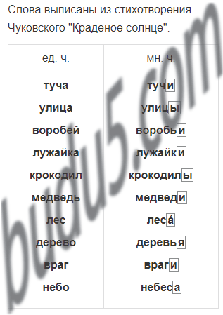 Выпиши из любого рассказа или стихотворения 10 существительных в единственном числе. Запиши их в столбик, рядом напиши эти существительные во множественном числе. Выдели окончания в словах второго столбика.