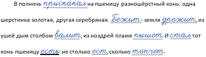 В полночь прискакал на пшеницу разношёрстный конь: одна шерстинка золотая, другая серебряная. Бежит - земля дрожит, из ушей дым столбом валит, из ноздрей пламя пышет. И стал тот конь пшеницу есть: не столько ест, сколько топчет.