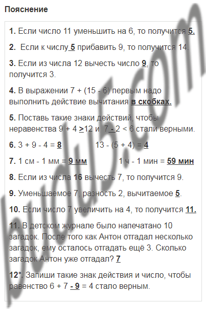 | 1. Если число 11 уменьшить на 6, то получится 2. Если к числу 3. Если из числа 12 вычесть число 4. В выражении 7 + (15 - 6) первым надо выполнить действие вычитания ___________________. 5. Поставь такие знаки действий, чтобы неравенства 9 + 4 >12 и 7 - 2 < 6 стали верными. 6. 3 + 9 - 4 = 7. 1 см - 1 мм = 8. Если из числа 9. Уменьшаемое 7, разность 2, вычитаемое 10. Если число 7 увеличить на 4, то получится 11. В детском журнале было напечатано 10 загадок. После того как Антон отгадал несколько загадок, ему осталось отгадать ещё 3. Сколько загадок Антон уже отгадал? 12∗. Запиши такие знак действия и число, чтобы равенство 6 + 7 |