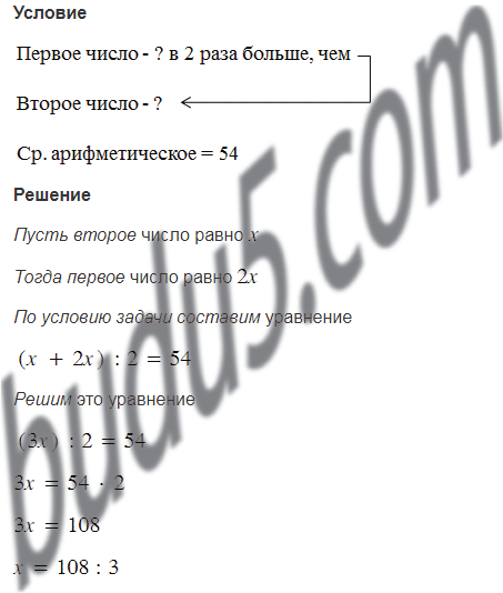Среднее арифметическое двух чисел равно 54. Одно число в 2 раза больше другого. Найдите эти числа.