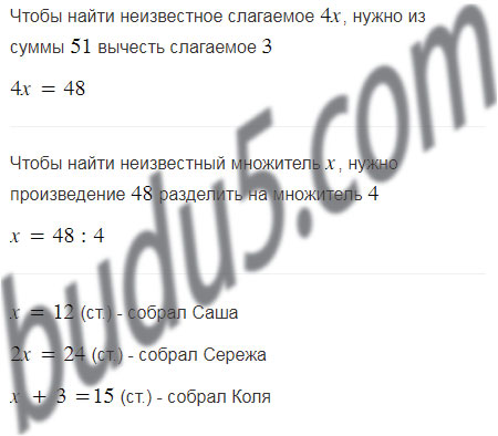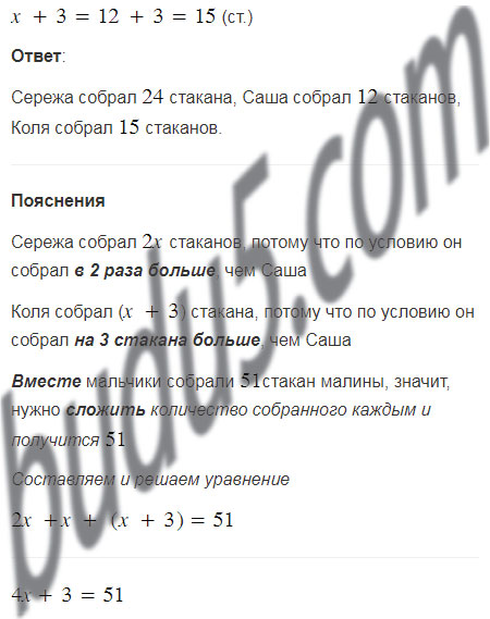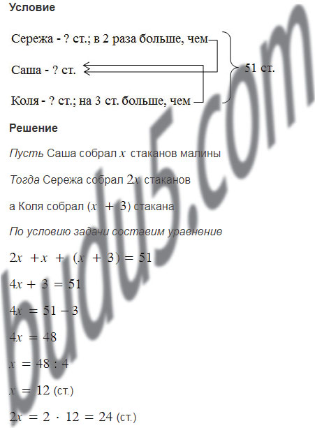 Саша, Коля и Серёжа собрали 51 стакан малины. Серёжа собрал в 2 раза больше малины, чем Саша, а Коля — на 3 стакана больше, чем Саша. Сколько стаканов малины собрал каждый из мальчиков?