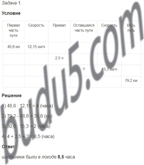 1) Школьники во время каникул совершили велосипедный поход. Весь путь составил 79,2 км. Первые 48,6 км они двигались со скоростью 12,15 км/ч и сделали привал на 2,5 ч, а потом ехали со скоростью 15,3 км/ч. Сколько времени школьники были в походе?