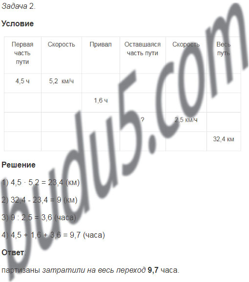 2) Отряд партизан, выполняя боевое задание, прошёл 32,4 км. Первые 4,5 ч они шли по дороге со скоростью 5,2 км/ч и сделали привал на 1,6 ч, а остальное время они шли по болотистой местности со скоростью 2,5 км/ч. Сколько времени партизаны затратили на весь переход?