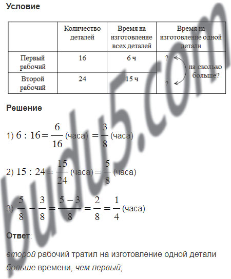 Один рабочий изготовил 16 одинаковых деталей за 6 ч, а другой — 24 такие же детали за 15 ч. Какой из них тратил на изготовление одной детали больше времени и на сколько?