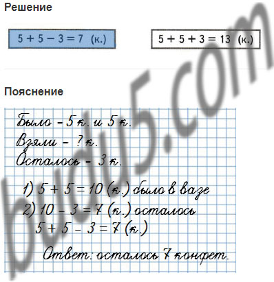 4∗. В вазе было 5 конфет. В вазу положили столько же конфет, сколько в ней было. После того как из вазы взяли несколько конфет, в ней осталось 3 конфеты. Сколько конфет взяли из вазы?