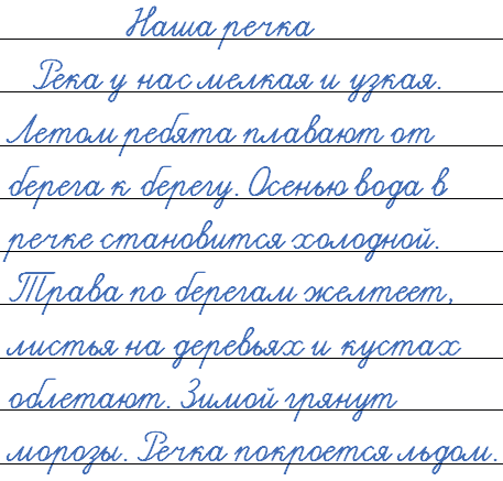 река у нас мелкая и узкая летом ребята плавают от берега к берегу осенью вода в речке становится холодной трава по берегам желтеет листья на деревьях и кустах облетают зимой грянут морозы речка покроется льдом