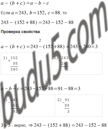 Запишите свойство вычитания суммы из числа с помощью букв a, b и c. Замените буквы их значениями: a = 243, b = 152, с = 88 - и проверьте получившееся числовое равенство.