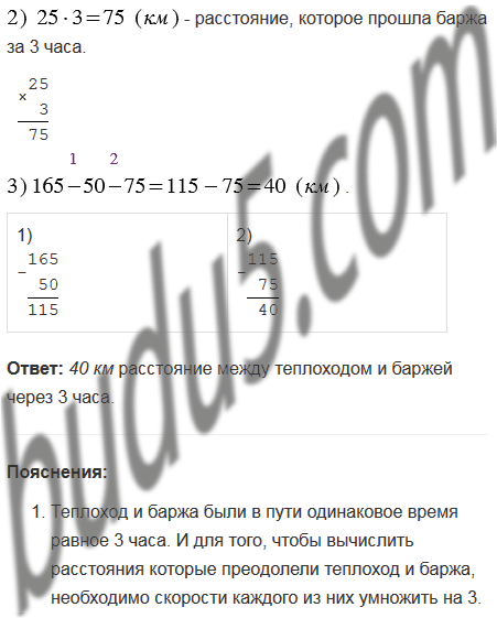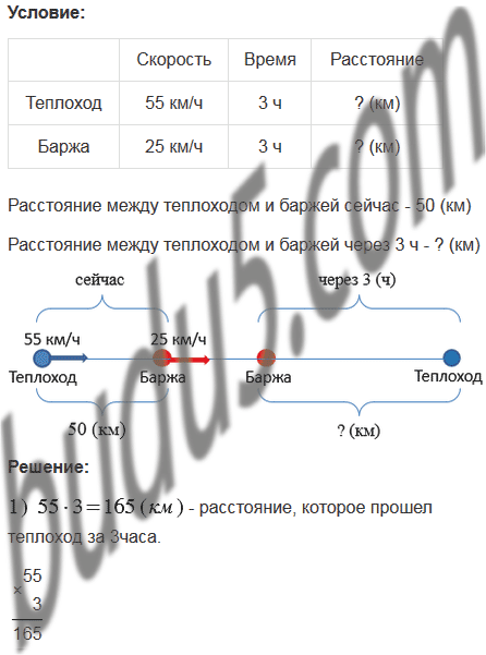 Теплоход "Ракета" идёт по реке со скоростью 55 км/ч. Впереди теплохода идет баржа со скоростью 25 км/ч. Какое расстояние будет между ними через 3 ч, если сейчас баржа впереди теплохода на 50 км?