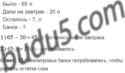 Имелось 65 л фруктового сока. Из них 20 л дали детям во время завтрака, а остальной сок разлили в трёхлитровые банки. Сколько банок для этого потребовалось?