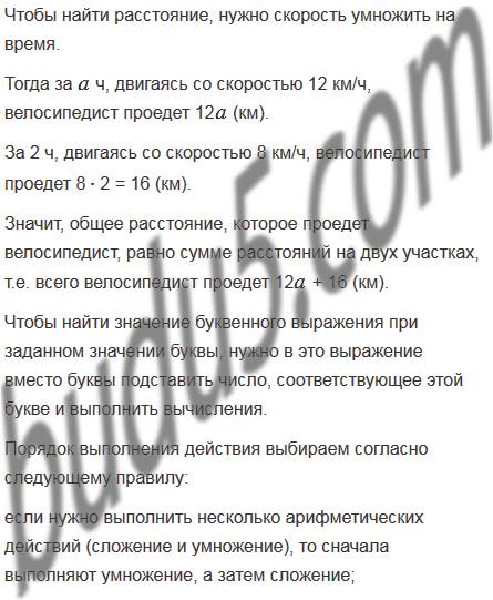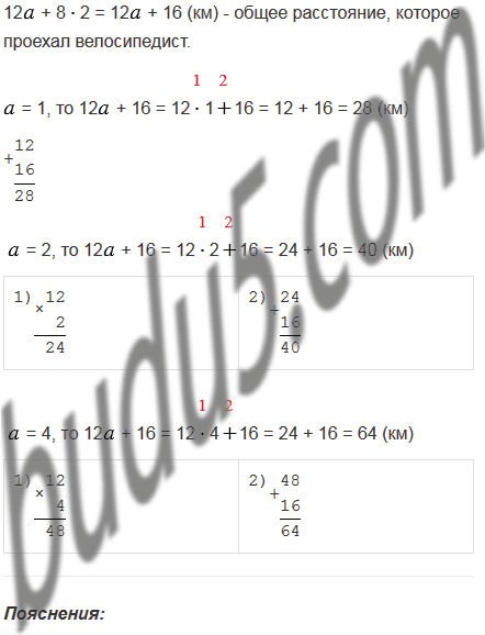 Велосипедист ехал ч со скоростью 12 км/ч и 2 ч со скоростью 8 км/ч. Сколько километров проехал велосипедист за это время? Составьте выражение для решения задачи и найдите его значение при = 1; 2; 4.
