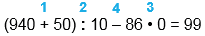 1) (940 + 50) : 10 - 86 • 0 = 99