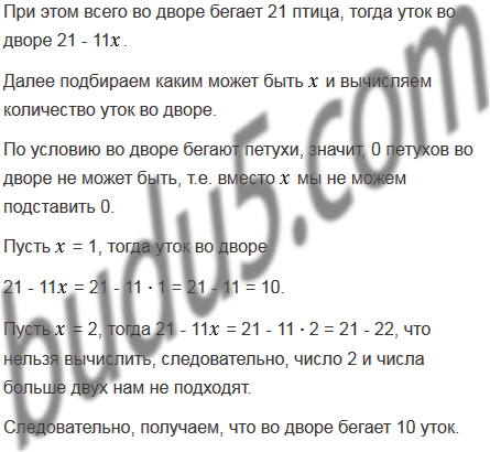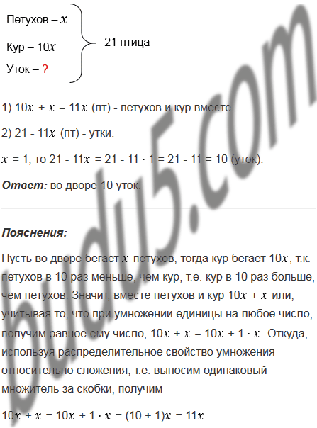 Во дворе гуляют куры, петухи и утки - всего 21 птица. Петухов в 10 раз меньше, чем кур. Сколько во дворе уток?