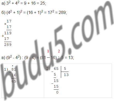 а) 32 + 42; в) (92 - 42) : (9 - 4);