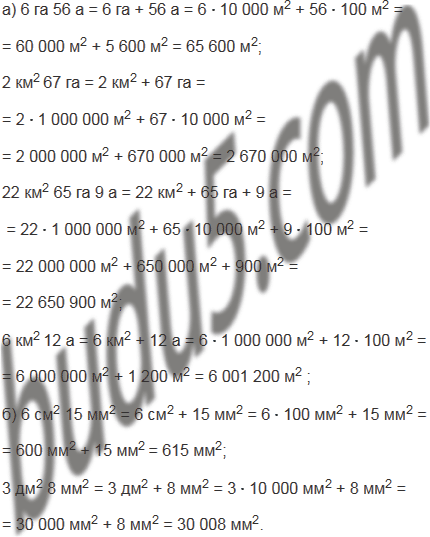 а) в квадратных метрах: 6 га 56 а; 2 км2 67 га; 22 км2 65 га 9 а; 6 км2 12 а;