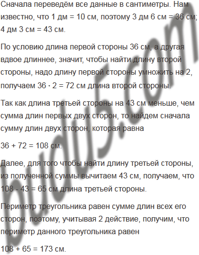 Одна из сторон треугольника имеет длину 3 дм 6 см, а другая вдвое длиннее. Длина третьей стороны на 4 дм 3 см меньше, чем сумма длин первых двух сторон. Найдите периметр треугольника.