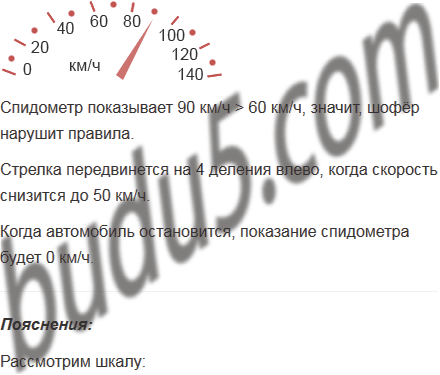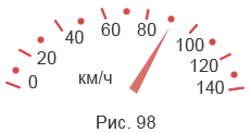 Автомобиль приближается к городу, по улицам которого разрешается ехать со скоростью не более чем 60 км/ч. В кабине автомобиля установлен спидометр - прибор, показывающий скорость движения. Посмотрите на спидометр (рис. 98). Нарушит ли шофёр правила уличного движения, если не снизит скорость? На сколько и в какую сторону передвинется стрелка, когда скорость снизится до 50 км/ч? Каким будет показание спидометра, когда автомобиль остановится?