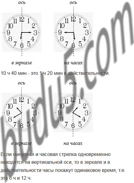 Сколько в действительности времени, если часы, отраженные в зеркале (рис. 113), показывают 9 ч; 8 ч; 6 ч 15 мин; 10 ч 40 мин? Когда часы и их отражение покажут одинаковое время?
