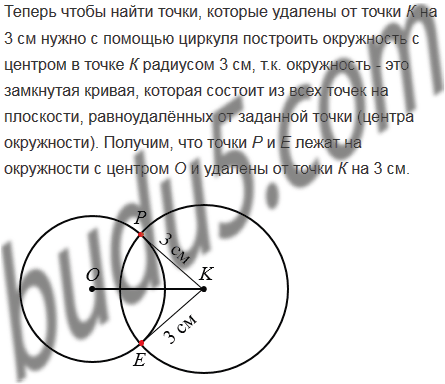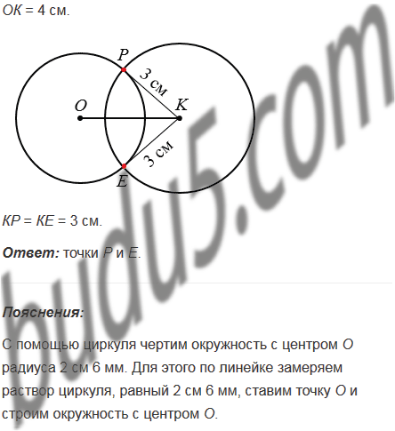 Начертите окружность с центром в точке О и радиусом 2 см 6 мм (рис. 114). Отметьте такую точку К, чтобы ОК = 4 см. Найдите с помощью циркуля на окружности точки, удаленные от точки К на 3 см.