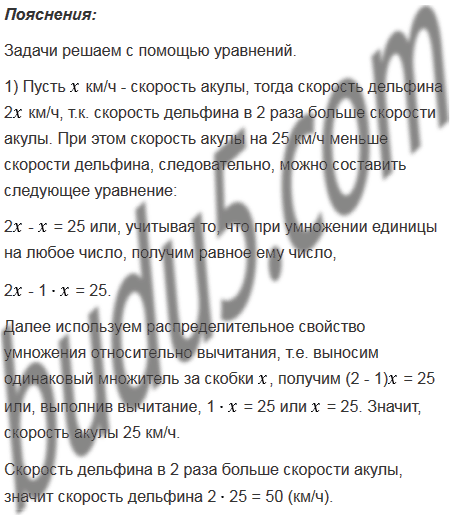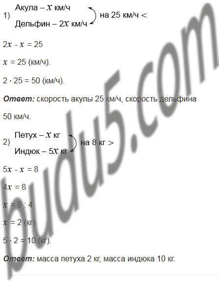 1) Скорость дельфина в 2 раза больше скорости акулы. Скорость акулы на 25 км/ч меньше скорости дельфина. Какова скорость каждого животного?