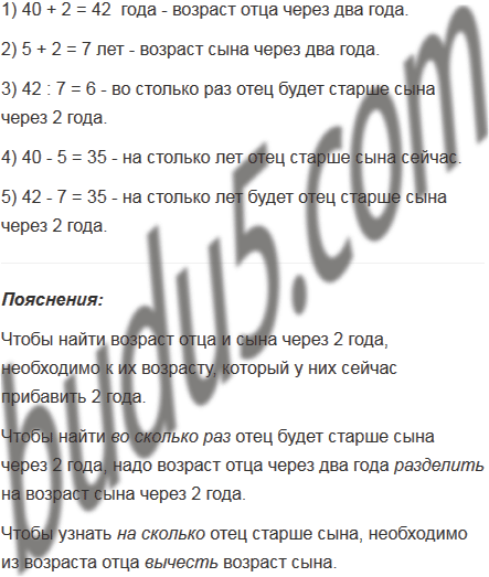 Отцу 40 лет, сыну 5 лет. Во сколько раз отец будет старше сына через 2 года? На сколько лет отец старше сына сейчас и на сколько лет будет старше через 2 года?