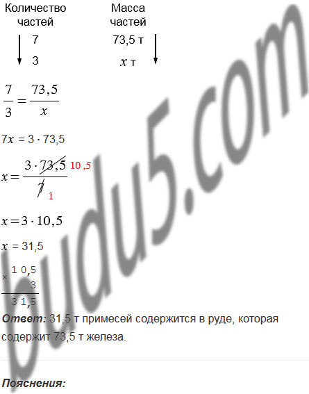 В железной руде на 7 частей железа приходится 3 части примесей. Сколько тонн примесей в руде, которая содержит 73,5 т железа?