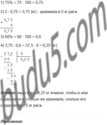 Рис содержит 75% крахмала, а ячмень - 60%. Сколько надо взять ячменя, чтобы в нем содержалось столько же крахмала, сколько его содержится в 5 кг риса?