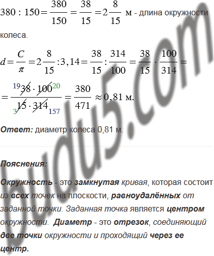 Колесо на расстоянии 380 м сделало 150 оборотов. Найдите диаметр колеса. Результат округлите до сотых метра (