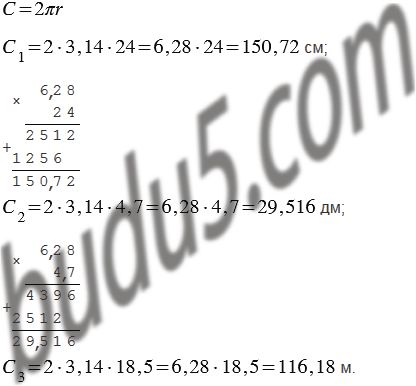 Найдите длину окружности, радиус которой равен 24 см; 4,7 дм; 18,5 м. Число