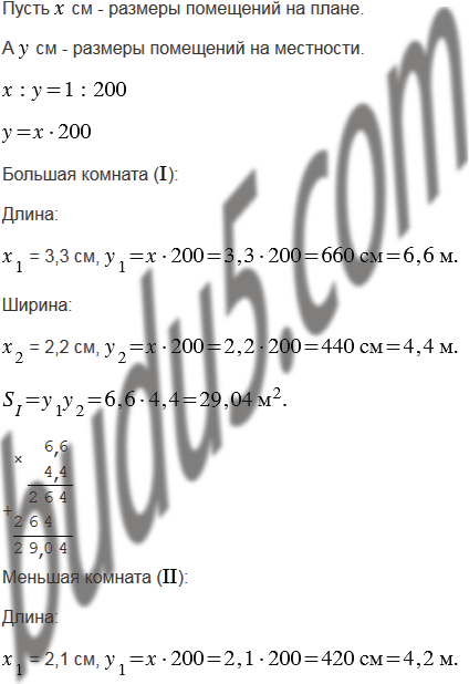 На рисунке 45 изображён план двухкомнатной квартиры в масштабе 1 : 200. Определите по плану сумму площадей двух жилых комнат (I и II) и площадь, которую занимают остальные помещения этой квартиры.
