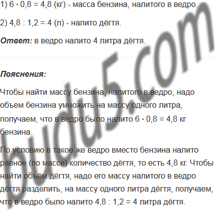 Ведро вмещает 6 л бензина. В такое же ведро вместо бензина налито равное (по массе) количество дёгтя. Сколько литров дёгтя налито в ведро, если масса 1 л бензина 0,8 кг, а масса 1 л дёгтя 1,2 кг?