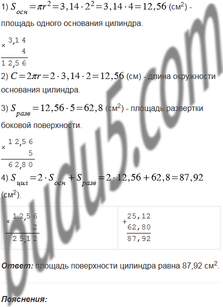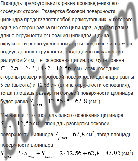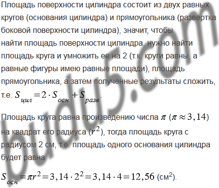 На рисунке 59, изображен цилиндр. Сверху и снизу цилиндр ограничен кругами, которые называются основаниями цилиндра. Развертка боковой поверхности цилиндра - прямоугольник. На рисунке 59, б изображена развертка поверхности цилиндра. Попробуйте вычислить площадь поверхности цилиндра, если его высота 5 см, а радиус оснований 2 см.