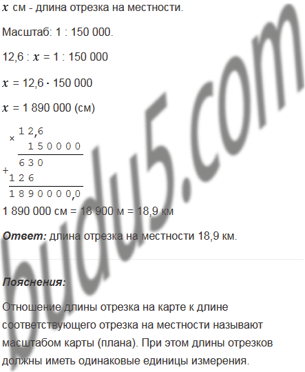 На карте отрезок имеет длину 12,6 см. Какова длина этого отрезка на местности, если масштаб карты 1 : 150 000?
