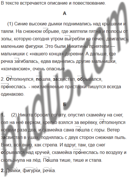 (2) Никита бросил лопату, опустил скамейку на снег, сел на неё верхом, крепко взялся за верёвку, о..толкнулся ногами раза два, и скамейка сама п.шла с горы. Ветер з..свистал в ушах, поднялась с двух сторон снежная пыль. Вниз, всё вниз, как стрела. И вдруг, там, где снег ..брывался над кручей, скамейка принеслась по воздуху и скользнула на лёд. П..шла тише, тише и стала.