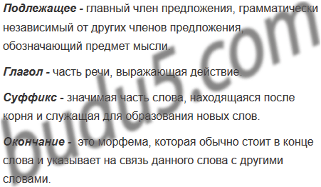 Вспомните, что означают слова: подлежащее, глагол, суффикс, окончание. Дайте им определение.