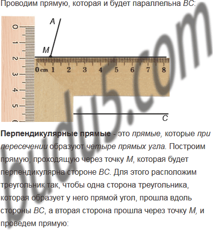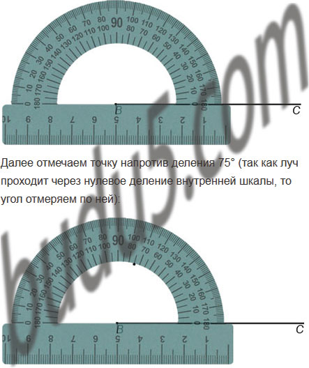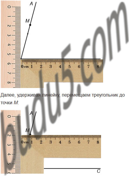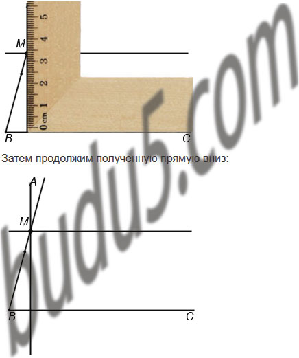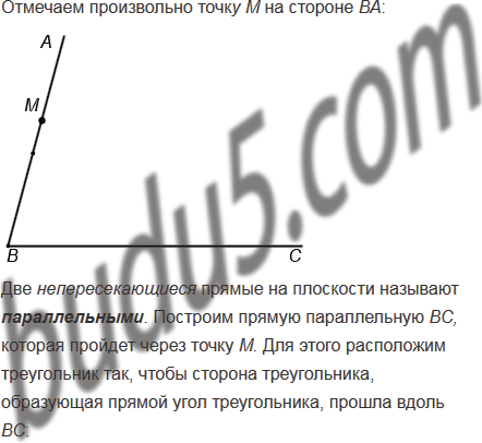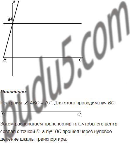 Начертите угол АВС, равный 75°. На стороне ВА отметьте точку М и проведите через неё две прямые, одна из которых параллельна, а другая перпендикулярна стороне ВС.