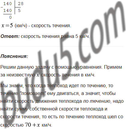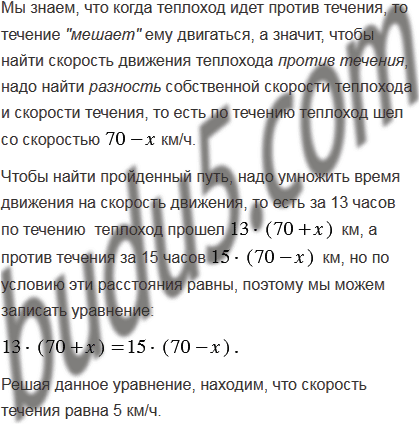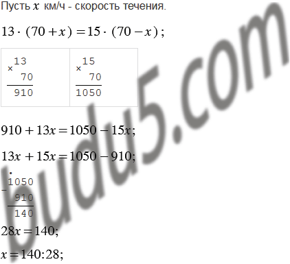 Теплоход проходит за 15 ч против течения столько же, сколько за 13 ч по течению. Найдите скорость течения, если собственная скорость теплохода 70 км/ч.