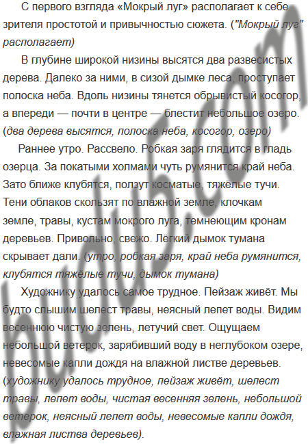 С первого взгляда «Мокрый луг» располагает к себе зрителя простотой и привычностью сюжета. В глубине широкой3 низины высятся два развесистых дерева. Далеко за ними, в сизой дымке леса, проступает полоска неба. Вдоль низины тянется обрывистый косогор, а впереди — почти в центре — блестит небольшое озеро. Раннее утро. Рассвело. Робкая заря глядится в гладь озерца. За покатыми холмами чуть румянится край неба. Зато ближе клубятся, ползут косматые, тяжёлые3 тучи. Тени облаков скользят по влажной земле, клочкам