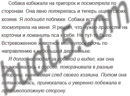 Собака (...) на пригорок и (...) по сторонам. Она явно (...) и теперь (...) своих хозяев. Я (...) поближе. Собака испуганно (...) на меня. Я решил, что нужно (...) на корточки и (...) пса к себе. Не тут-то было. Встревоженное животное (...) прочь по направлению к небольшой деревеньке.