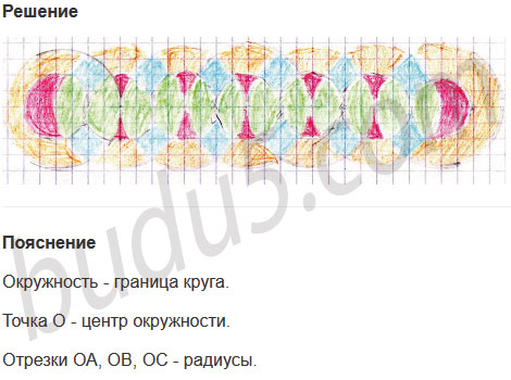 Задание № 16. Отметь на клетчатой бумаге точки в ряд через 1 см. Проведи последовательно окружности с центрами в данных точках и радиусом 2 см. Раскрась получившийся узор.