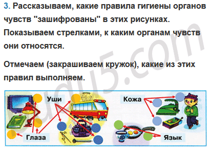 3. Расскажи, какие правила гигиены органов чувств "зашифрованы" в этих рисунках. Покажи стрелками, к каким органам чувств они относятся.