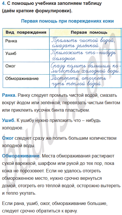 4. С помощью учебника заполни таблицу "Первая помощь при повреждениях кожи" (дай краткие формулировки).