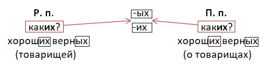 Имена прилагательные во множественном числе в родительном и предложном падежах имеют окончания: - ых, -их.