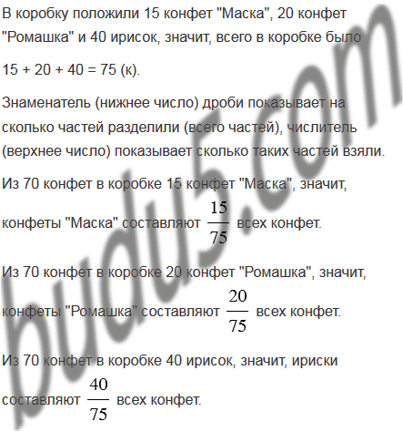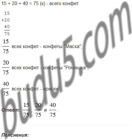 В коробку положили 15 конфет "Маска", 20 конфет "Ромашка" и 40 ирисок. Какую часть всех конфет составляют конфеты каждого сорта?