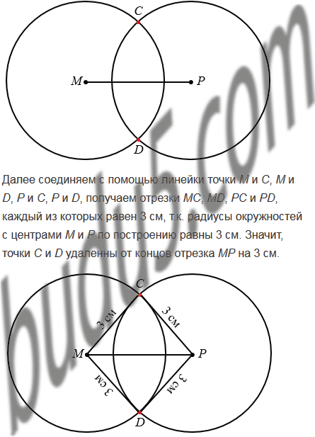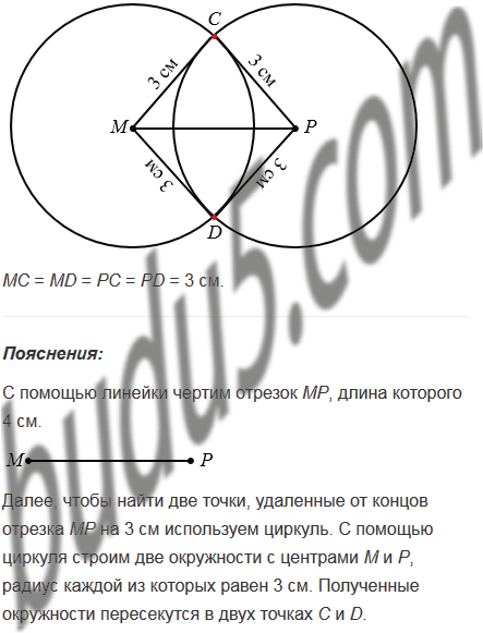 Начертите отрезок МР, длина которого 4 см, и найдите две точки, удаленные от концов отрезка на 3 см.