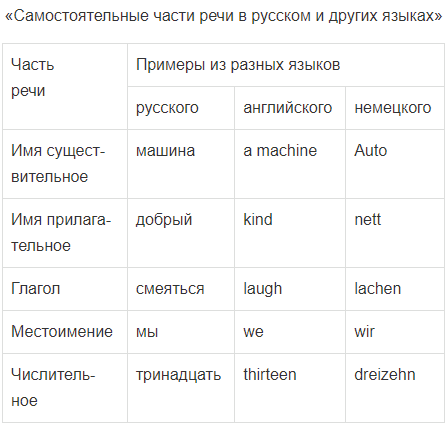 Составьте таблицу «Самостоятельные части речи в русском и других языках (английском, немецком, французском и др.)». Отберите и систематизируйте примеры, заполните ими графы таблицы.