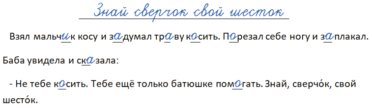 Взял мальч_к косу и з_думал тр_ву к_сить. П_резал себе ногу и з_плакал. Баба увидела и ск_зала: