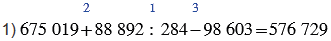 1) 675 019 + 88 892 : 284 - 98 603;
