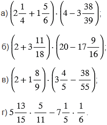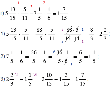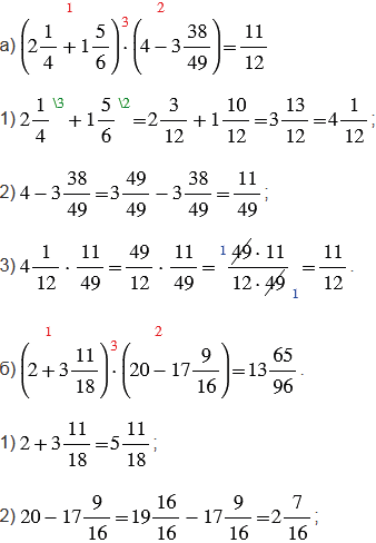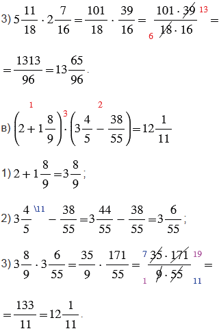 6) чтобы выполнить умножение смешанных чисел, нужно записать эти числа в виде неправильных дробей, а затем воспользоваться правилом умножения дробей. Чтобы преобразовать смешанное число в неправильную дробь, надо целую часть числа умножить на знаменатель дробной части и к полученному произведению прибавить числитель дробной части; эту сумму записать как числитель неправильной дроби, а в ее знаменатель записать знаменатель дробной части смешанного числа.