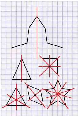 Фигура симметрична относительно прямой, если эта прямая делит ее на две части, симметричные друг другу (то есть если согнуть фигуру по этой прямой ее части совпадут).