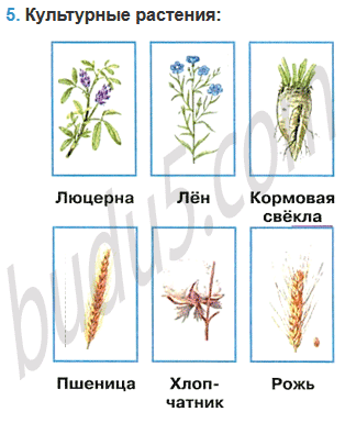5. Мама Серёжи и Нади интересуется, знаешь ли ты культурные растения. Вырежи рисунки из Приложения и помести их в соответствующие окошки. Попроси соседа по парте проверить твою работу. После проверки наклей рисунки.